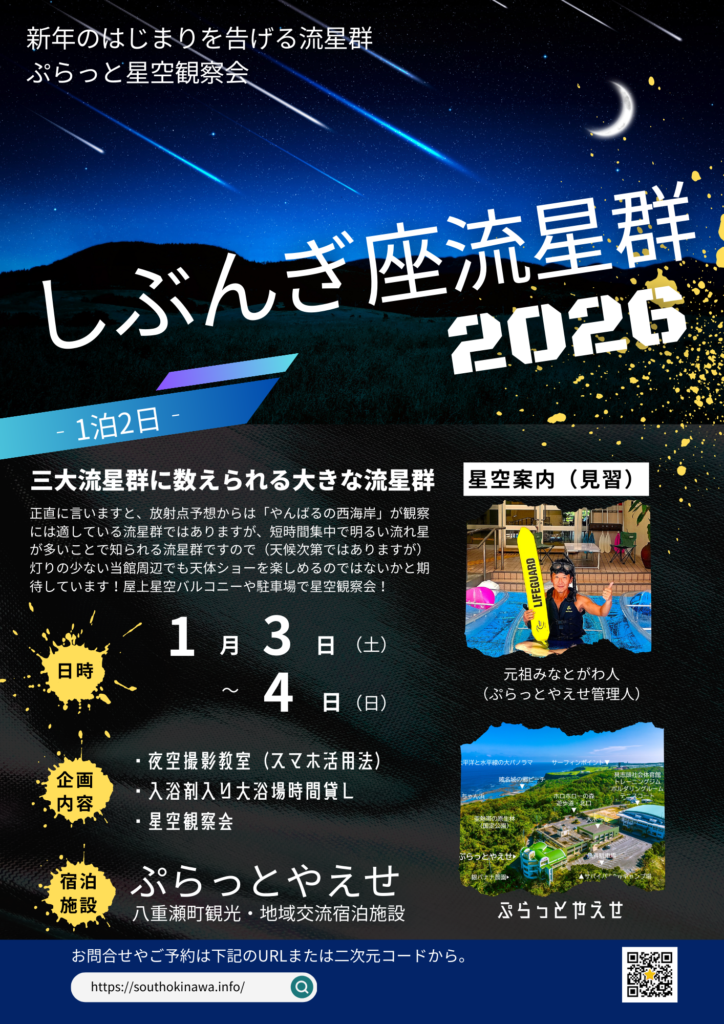 しぶんぎ座流星群が最も活発となる2026年1月3日(土)~1月4日(日)、1泊2日の宿泊型プランとして三大流星群のひとつ「しぶんぎ座流星群」の観察会を行います~ 天候次第ではありますが、流れ星の数の多さ、流れ星の明るさで祐無いな流星群ですのできっと楽しいハズ!加えて、冬の夜空に輝く1等星・シリウスや圧倒的な存在感のジュビター(木星)、オリオン座なども観察しましょう!
