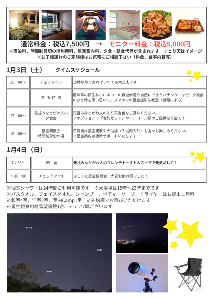 1泊2日・2食付き|貸切大浴場(入浴剤入り)|星空案内|望遠鏡・専用チェア有り